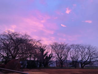 これは、今朝さくら荘から見たAM6:30の空。写真のように、空一面がピンク色でとても美しい景色でした♡