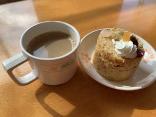 これは非常食用の缶パンに生クリームとドライフルーツでデコレーションしたものと、カフェオレです。