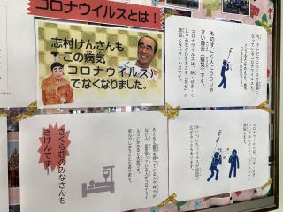 そんな利用者さんに、「新型コロナウイルス」について知ってもらおうと、職員のアイディアでこんな掲示をしました!!