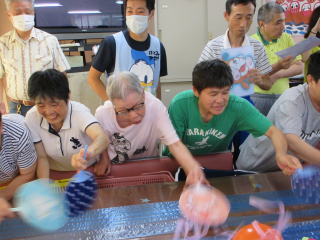 アイテムは様々。内輪や手動扇風機、ちりとり、クリアファイル、ドライヤーなどで風を送り向かいのかごにボールを入れます。